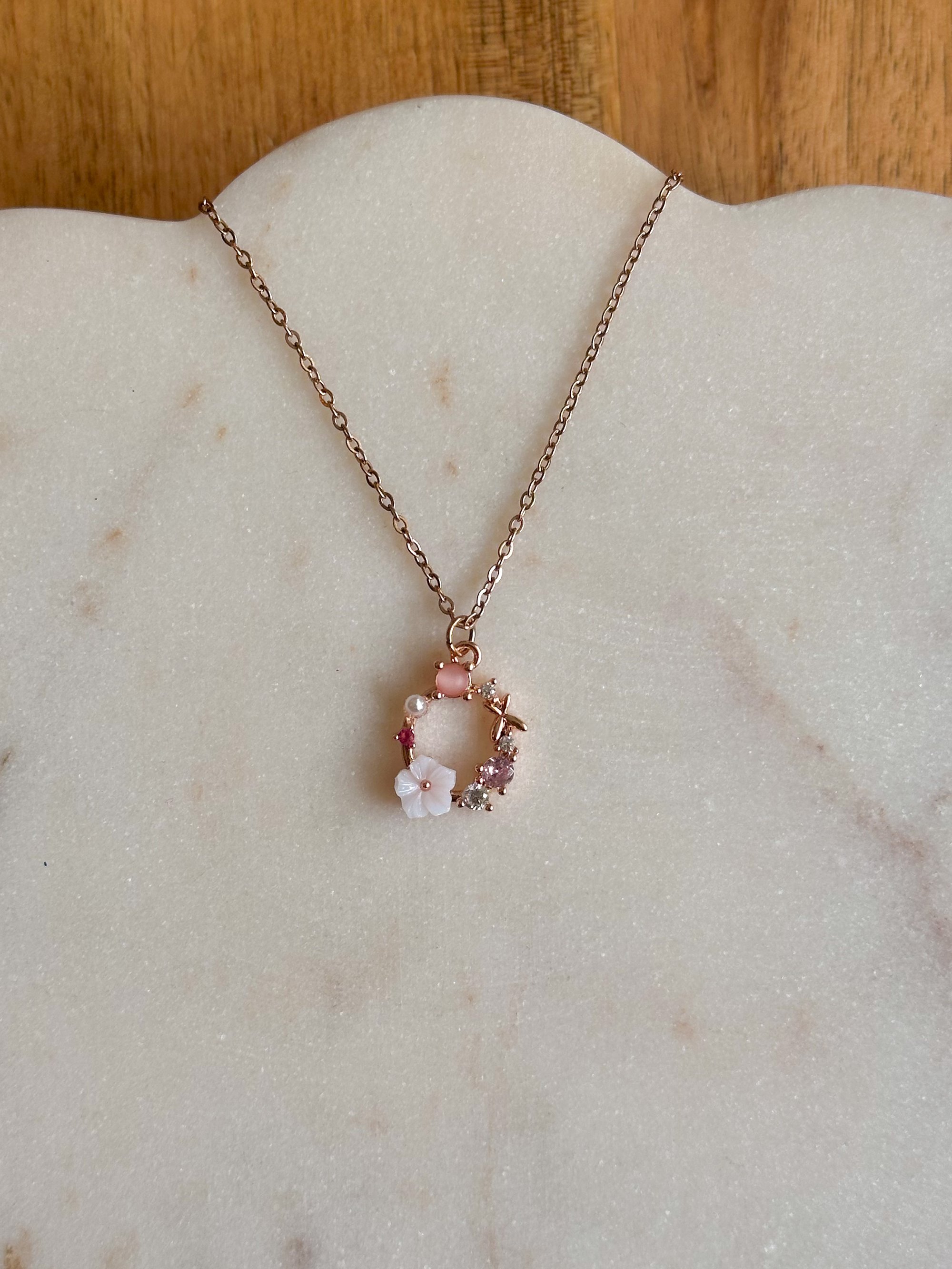 🩷 Pink opalite, pearls, ruby zircons, and acrylic flowers in a dainty rose gold plated wreath ~10mm
